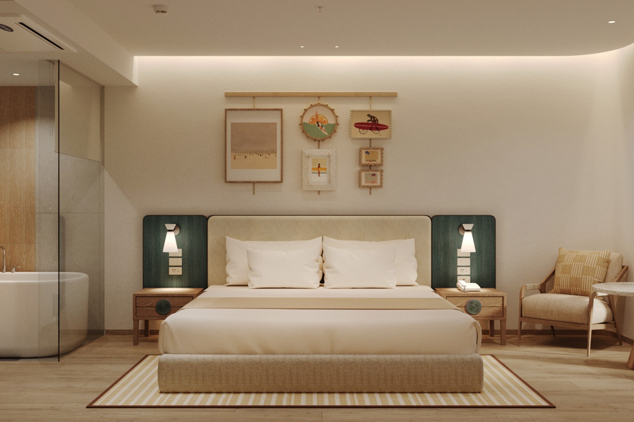 Relax on your private balcony, overlooking our pool, which mirrors the aesthetic of shining sand and sea.